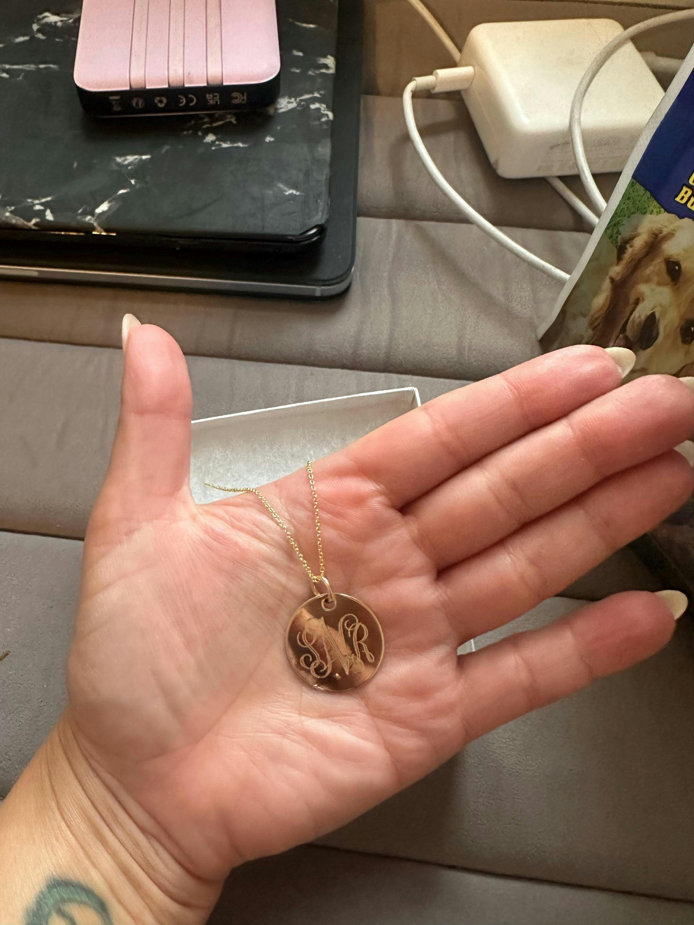• This Engraved monogram necklace is hand cut out of heavy 14k gold filled sheet